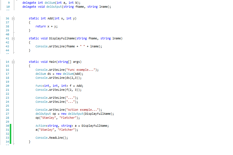 1. I create a delegate which takes 2 ints and returns an int: delegate int delSum(int a, int b);
